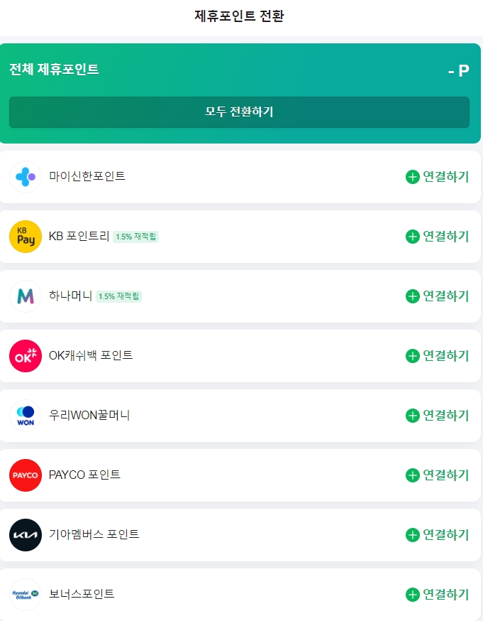 포인트 전환에 들어가면 제휴포인트 전환이 있습니다. 여기에는 신한, 국민, 하나, OK캐쉬백, 우리, 페이코 등등 여러가지의 포인트로 전환할 수 있는 제휴처가 있습니다.
