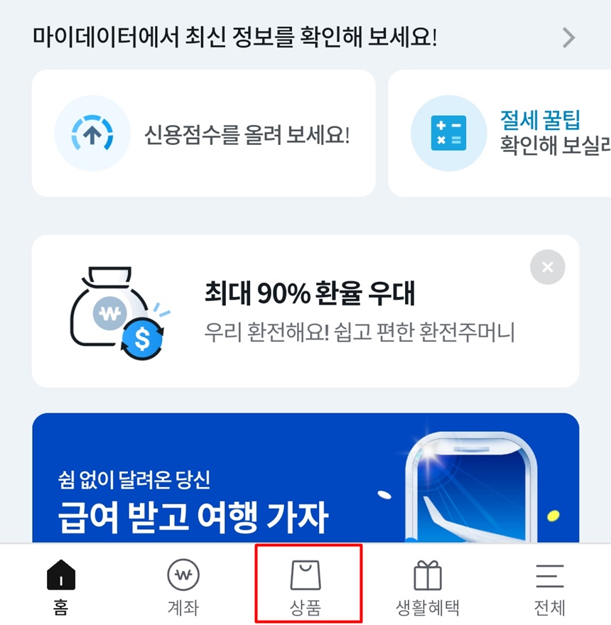 앱(어플)이용 시 우리WON 어플에 접속 후 하단에 있는 상품 탭을 눌러줍니다.