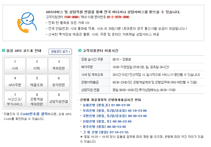나무증권 고객센터 이용 시 상담원 연결 빠르게 가능한 연결 단축번호 함께 안내드립니다. 나무증권 고객센터 번호 1544-0000으로 연결 후 0번을 누르면 상담직원 연결이 됩니다. 그 외에도 시세는 1번, 이체는 2번, 계좌관련 3번, ARS 주문 4번, 체결조회 5번, 청약 관련 6번, 사고신고/부가서비스 7번, 은행개설 계좌 관련은 8번 단축번호를 눌러주시면 됩니다.