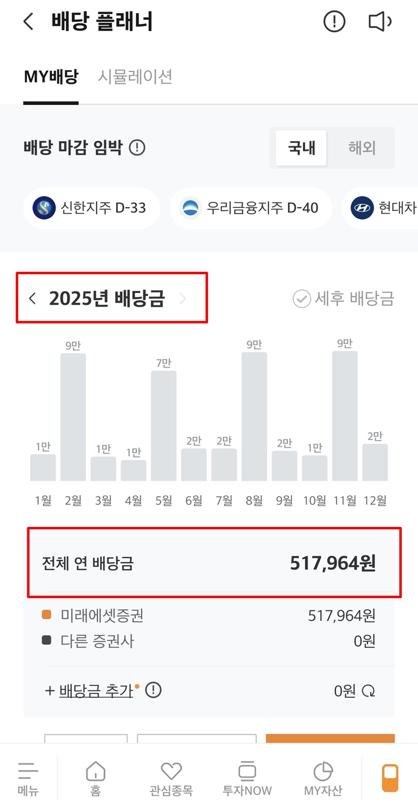 간단한 방법으로 미래에셋증권 배당금 확인과 예상배당금, 배당예정일까지 모두 조회가 가능합니다. 자산 계획을 세울 때 배당금도 중요한 역할을 하기 때문에 미리 확인하셔서 자금 계획을 세우실 때 도움이 되시길 바랍니다.
