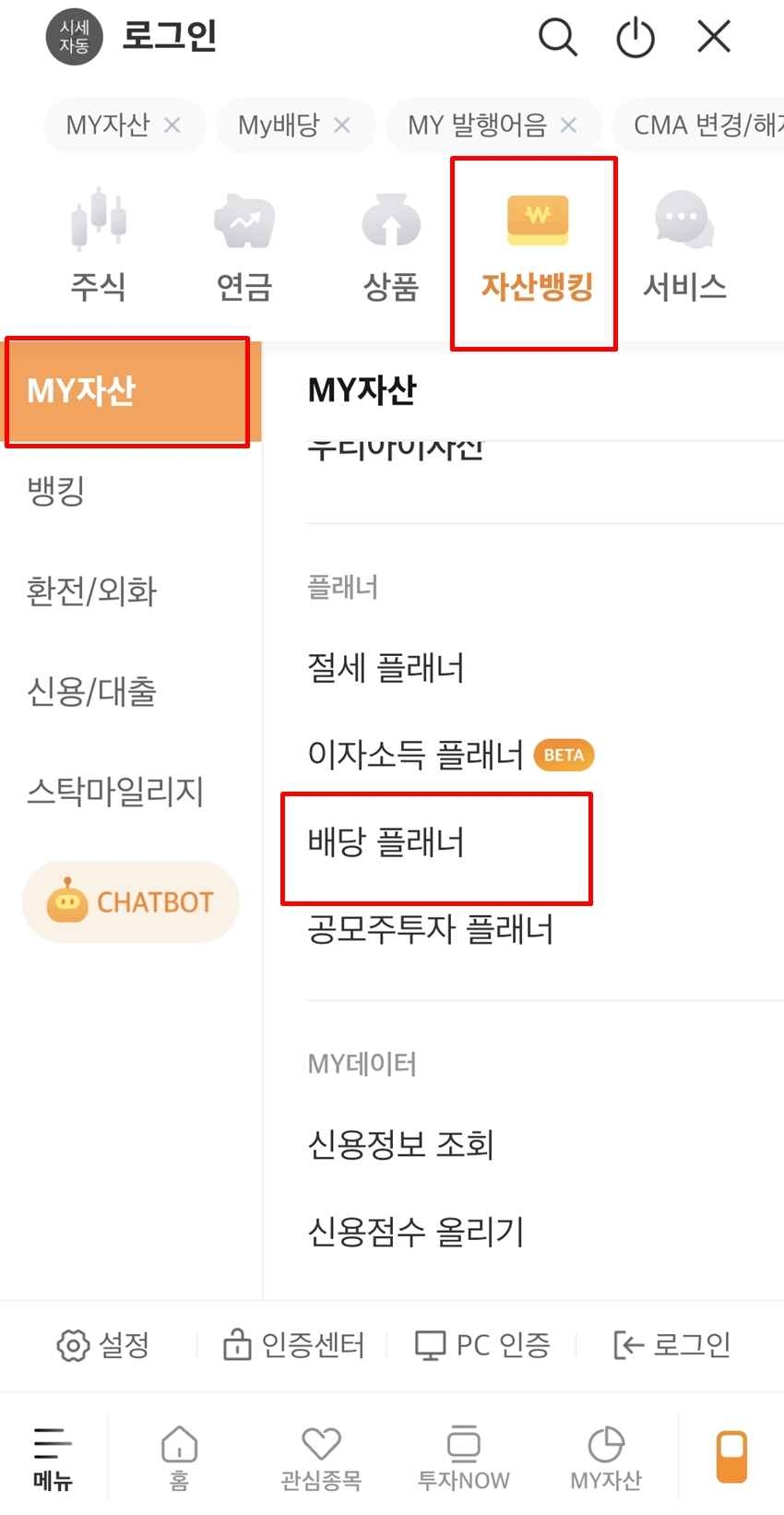 1. 미래에셋증권 어플 접속 후 하단 왼쪽에 있는 바 세개를 클릭합니다. 그 뒤 주식, 연금, 상품, 자산뱅킹, 서비스 중 자산뱅킹으로 들어갑니다. 자산뱅킹 - MY 자산 - 배당플래너 탭으로 들어갑니다.
