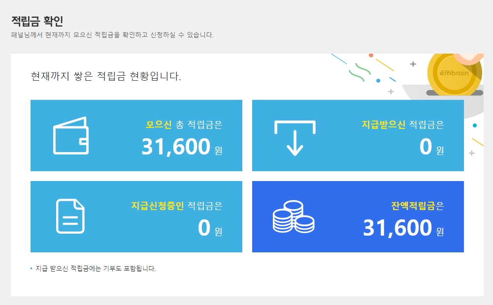 엠브레인 부수입 수익인증은 31,600원입니다. 좌담회 참여는 진행하지 않았고 순수 설문 조사만으로 모은 금액입니다.엠브레인의 설문조사는 참여를 많이 하지 않은 편인데도 건당 비용이 높았던 것 같습니다.