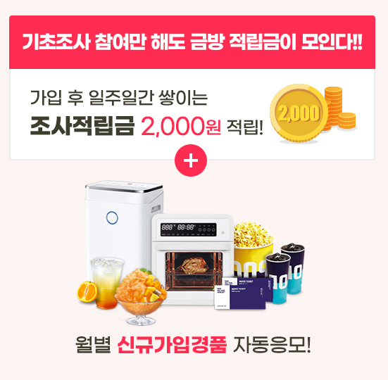 엠브레인 패널파워는 가입 후 기초조사만 해도 2,000원이 적립됩니다. 또한 신규가입 혜택도 다양해서 가입만 하더라도 신규 이벤트에 자동 응모가 됩니다.