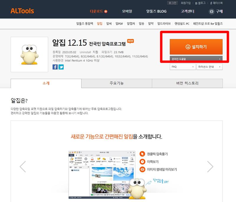 1. 알집 무료 다운로드 사이트 접속 후 우측에 있는 설치하기를 눌러 줍니다.