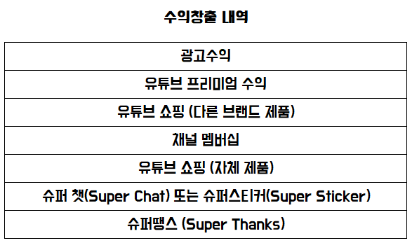 해당 조건이 달성되면 아래 내역을 통해 유튜브 광고 수익을 가져갈 수 있습니다. 광고수익, 유튜브 프리미엄 수익, 유튜브 쇼핑 수익 외에도 멤버십, 쇼핑, 슈퍼챗 등의 내역이 있습니다.