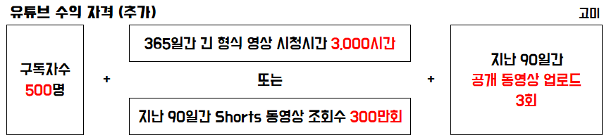 구독자가 500명으로 줄었을 뿐만 아니라 4,000시간에서 3,000시간으로 1,000시간이 줄었습니다. 또한 쇼츠 조건이 대거 완화 되었는데요 Shorts 조회수가 1,000만회에서 300만회로 변경 되었습니다. 대신 조건이 1개 추가 되었는데, 지난 90일간 공개 동영상 업로드가 3회 있어야 합니다.
