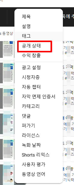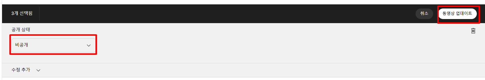 1. 일괄로 영상을 선택한 뒤 수정, 재생목록에 추가, 추가작업 중 수정을 눌러줍니다. 수정-공개 상태 버튼을 눌러줍니다.