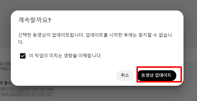 3. 계속할까요? 라는 안내버튼과 함께 선택한 동영상이 업데이트 된다는 창이 뜹니다. 이 작업이 미치는 영향을 이해합니다.를 선택 후 동영상 업데이트를 눌러줍니다.
