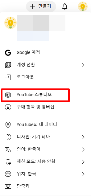 1. 유튜브 접속 한 뒤 우측 상단 프로필을 눌러줍니다. 그 뒤 유튜브 스튜디오에 접속합니다. 유튜브 스튜디오에는 영상 공개, 비공개 외에도 영상 관리에 대한 모든 것을 진행할 수 있습니다.