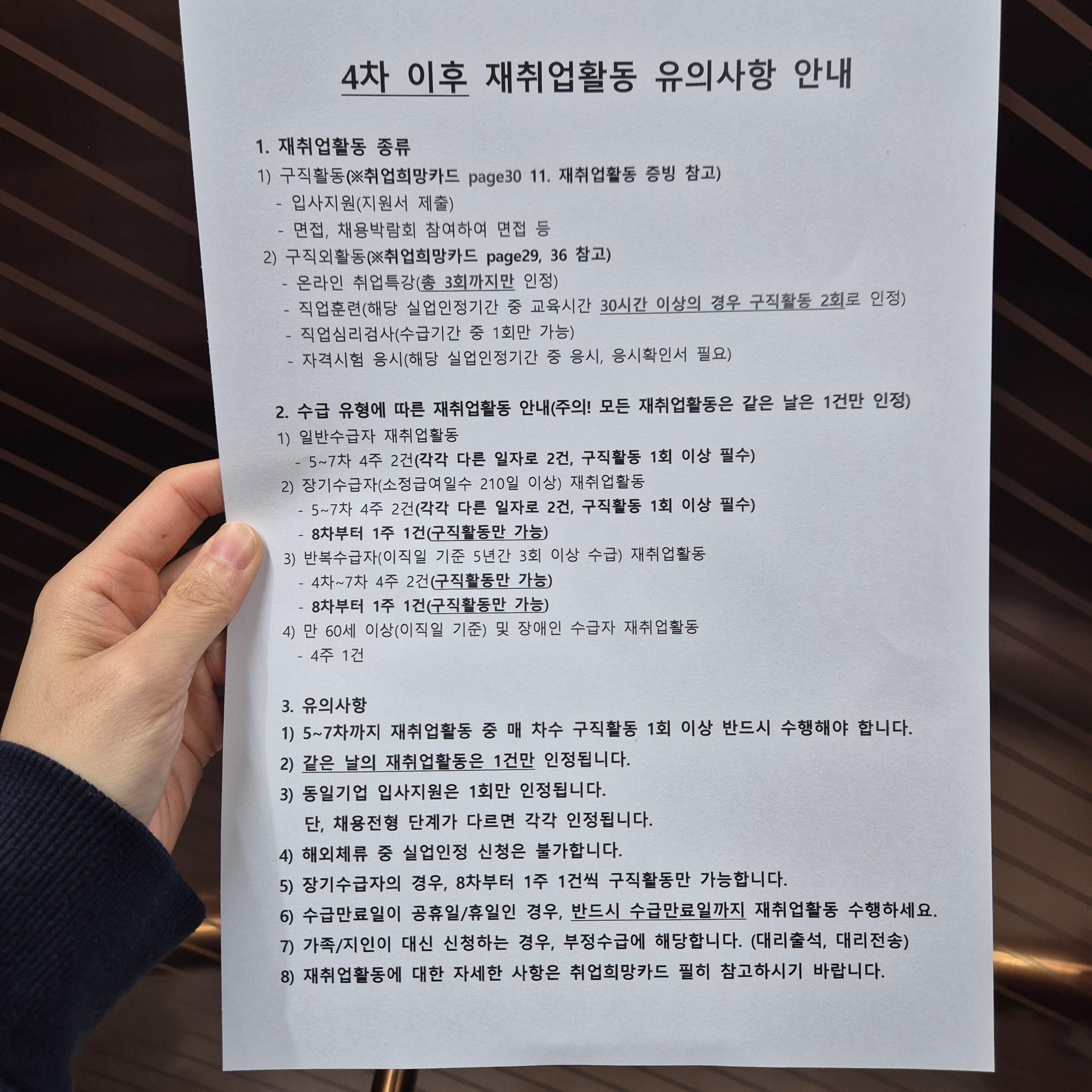 이후 5차부터 진행할 사항에 대한 유의사항과 함께 실업급여 안내사항을 줍니다. 아래 내용을 꼼꼼하게 읽은 뒤 이후 진행하는 실업급여 수급자격을 잘 맞춰야 합니다. 실업급여 5차부터는 구직활동을 포함한 재취업활동을 해야한다는 점을 유의해야 합니다.