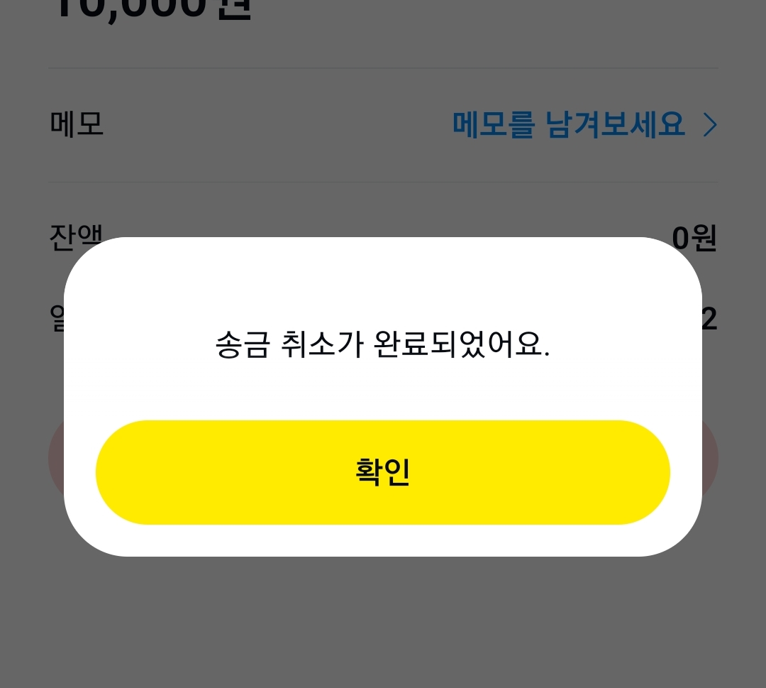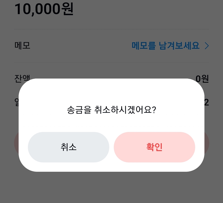 송금완료 후 완료 메시지가 뜨는데 여기 금액을 보니 잘못되었다고 느끼면 바로 취소를 눌러줄 수 있습니다. 우측 상단에 보이는 송금취소를 눌러주시면 바로 송금 취소가 진행됩니다.