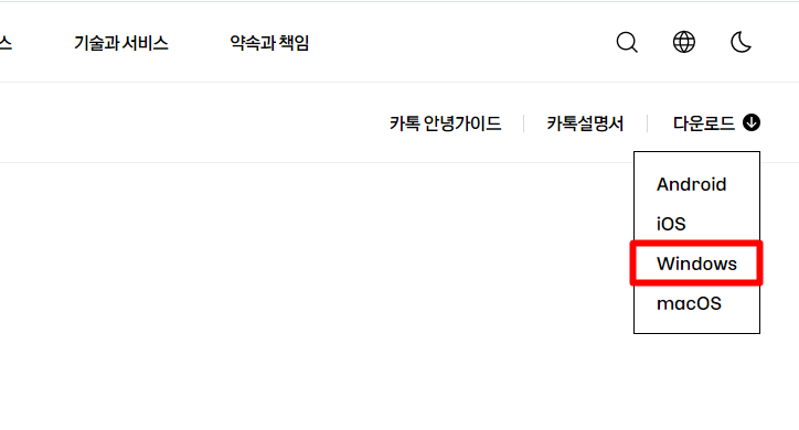 위에 안내드린 사이트 접속 후 우측 상단에 다운로드 버튼을 클릭하면 안드로이드, IOS, WINDOWS, MACOS라고 뜹니다. 일반 노트북이나 PC, 컴퓨터라면 Windows를 눌러 주시면 되고 맥을 이용하는 경우라면 macOS를 눌러줍니다.