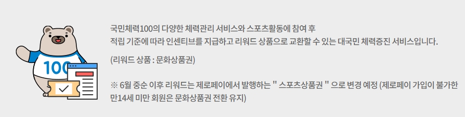 리워드는 5월까지는 문화상품권으로 지급되며 6월 중순 이후에는 제로페이에서 발행하는 '스포츠상품권'으로 변경되어 발행됩니다. 14세 미만 회원은 문화상품권으로 지속 지급됩니다.
