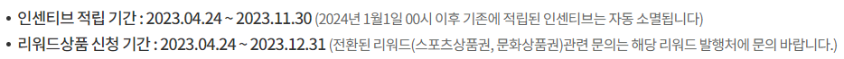 인센티브(운동지원금) 적립 기간은 23년 4월 24일부터 23년 11월 30일까지이며, 리워드상품 신청 기간은 23년 4월 24일부터 23년 12월 31일입니다.